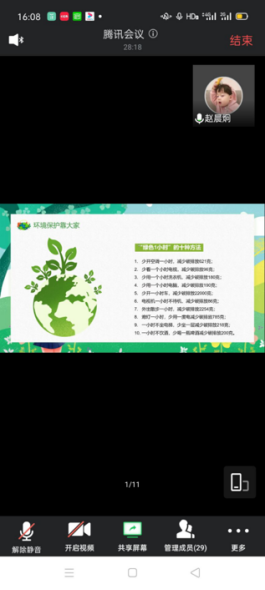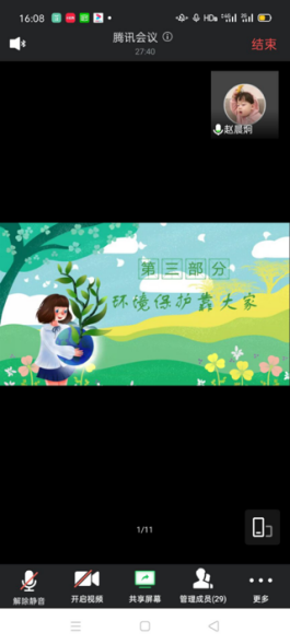 6月5日,以团支部为单位统一组织成员观看了王久良导演作品《垃圾围城》纪录片。6月11日,通过腾讯会议组织成员们进行会议学习有关文明礼仪,环境保护的知识。活动中同学们积极参与,踊跃分享自己的见解。通过此次活动,同学们遵守文明礼貌、团结友爱、勤俭节约、保护环境等社会公德的意识得到了加强,使“不仅要做文明言行的参与者、实践者和传播者,更要做环保卫生的实践者和守护者”的观念深人人心。