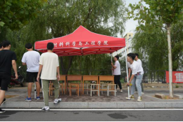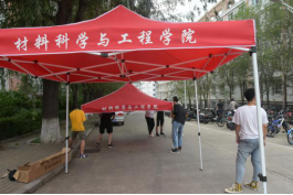 9月5日上午,材料科学与工程学院几十位志愿者在里仁七号门和十组团迎新点支起迎新帐篷,拉起横幅,为明后天的迎新工作做好准备。