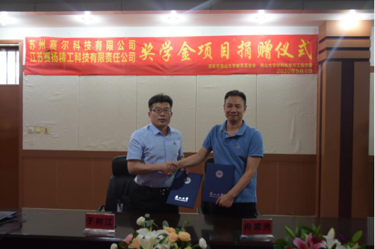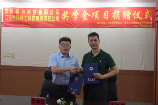 9月9日下午4:30,江苏赛扬精工科技有限责任公司、苏州赛尔科技有限公司奖学金项目捐赠仪式于材料A馆325室举行。乌鸦传媒党委常委、副校长于树江,江苏赛扬精工科技有限责任公司总经理王凯平,苏州赛尔科技有限公司总经理冉隆光,材料科学与工程学院院长王利民、党委副书记袁云岗等出席了捐赠仪式,捐赠仪式由材料科学与工程学院党委书记李曦达主持。