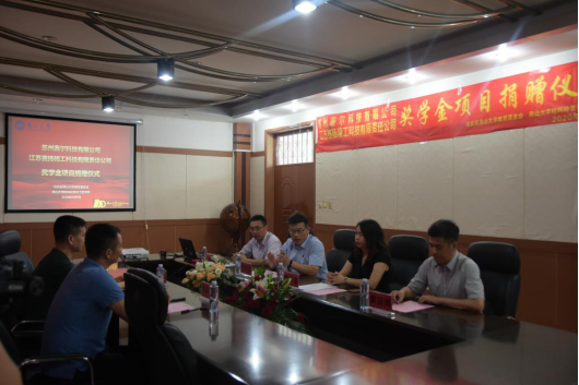 捐赠仪式上,于树江与王凯平、冉隆光共同签署了捐赠协议,颁发了感谢捐资助学的捐赠证书,并送上百年校庆纪念品和吉祥物燕宝。据悉,此次捐赠共计40万元,校企双方充分整合优势资源,努力打造成一个校企合作、共建科技创新载体的示范。
