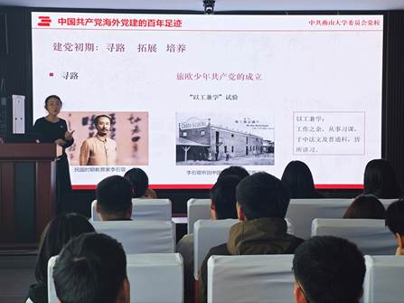 在中华民族曾经的危亡时刻,无数热血青年奔赴海外,寻求救国真理,为党和国家的事业奠定了坚实基础。为深入探寻中国共产党海外党建的历史脉络,汲取奋进力量,4月24日下午14:00,材料科学与工程学院分党校邀请马克思主义学院包巍教授在材料学院行政楼113会议室以《中国共产党海外党建的百年足迹》为主题,为学院24名发展对象和41名学生党员讲授专题党课。