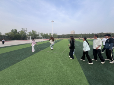 “起绳!”裁判哨音未落,长绳已化作银色闪电划破晴空。在“8”字跳大绳赛场,学生干部们化身破浪的飞舟,步伐如尺规丈量般精准,起落似机械钟表般默契。当第50次跳跃完美落地,这不仅是体能的突破,更是学生工作“令行禁止、步调一致”的作风锤炼。