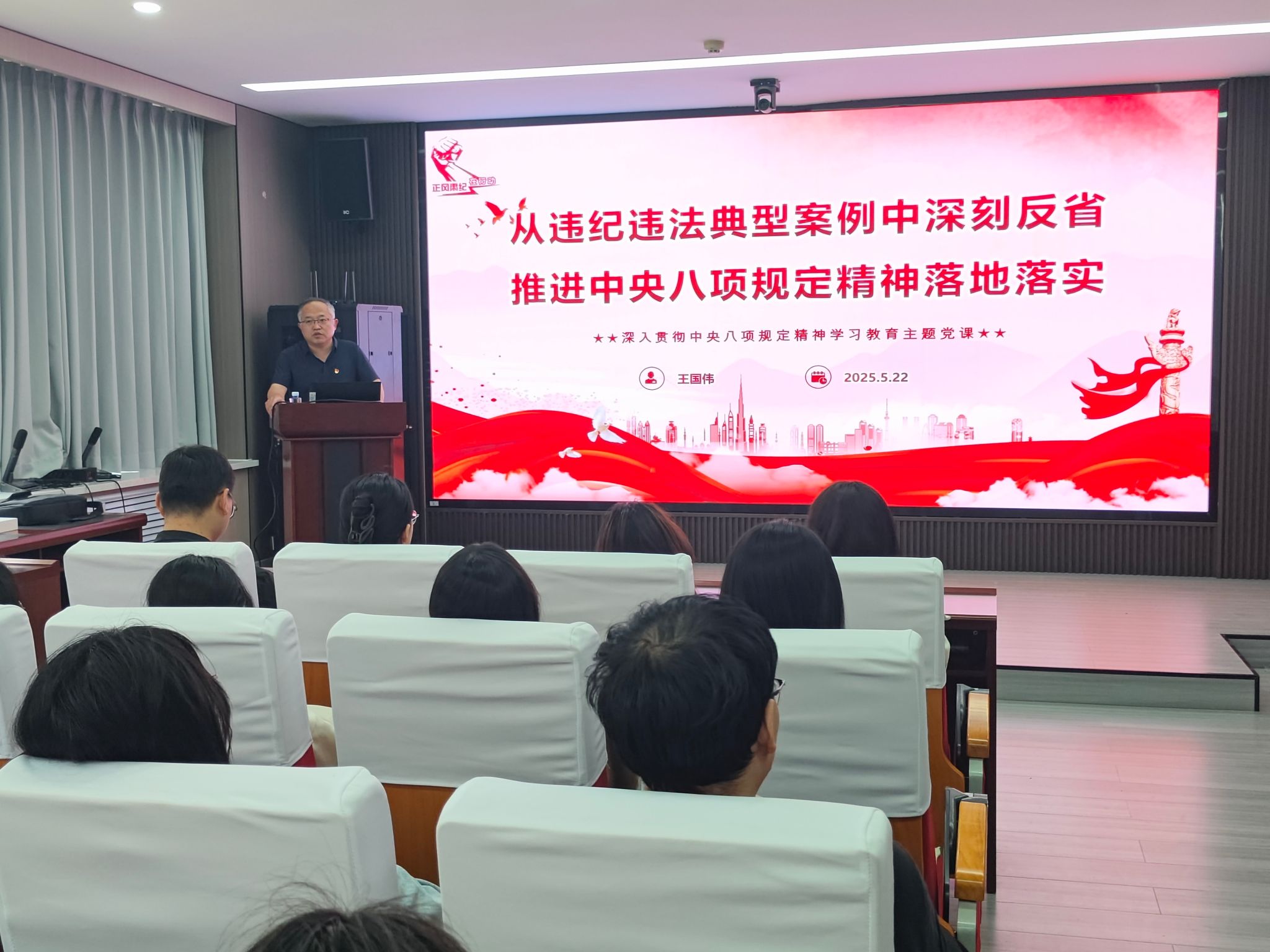 王国伟为同学们解读了中央八项规定的具体内容,阐释了中央八项规定精神的核心要义与实践要求。中央八项规定精神是全面从严治党的重要抓手,是密切党同人民群众血肉联系的桥梁纽带,更是推动党风政风持续好转、引领社会风气向上向善的强大动力。深刻领会其精神实质,不仅有助于树立正确的价值观和权力观,更能为今后投身社会、服务人民奠定坚实的思想基础。在典型案例剖析环节,一个个鲜活而又触目惊心的违纪违法案例,同学们清晰地看到违纪违法行为的严重后果和巨大危害。王国伟强调,全体同学要从案例中汲取教训,时刻保持清醒头脑,自觉筑牢拒腐防变的思想防线,做到心有所畏、言有所戒、行有所止。不断加强自身的党性修养,坚定理想信念,共同营造风清气正的良好氛围。