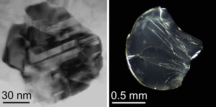 左图为纳米孪晶金刚石显微组织的典型透射电镜照片,右图为透明纳米孪晶金刚石样品的光学照片(合成压力20GPa,合成温度2000 °C)。照片由徐波、胡文涛和黄权提供。